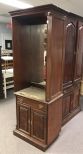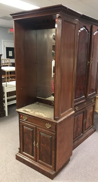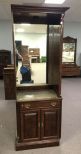 American of Martinsville Cherry Bookcase, two piece, part of the entertainment center, one side is flat, mirrored back, has finish wear, 81"h., 29"w., 19"d. American of Martinsville Cherry Bookcase, two piece, part of the entertainment center, one side is flat, mirrored back, has finish wear, 81"h., 29"w., 19"d.