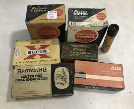 Peter Victor empty 12 gauge boxes, Western X power point empty, Brown 22-250 rem partial box, Remington Kleanbore 9mm luger, Alcan 9mm, and Daisy BBs. Peter Victor empty 12 gauge boxes, Western X power point empty, Brown 22-250 rem partial box, Remington Kleanbore 9mm luger, Alcan 9mm, and Daisy BBs.