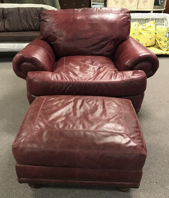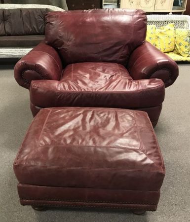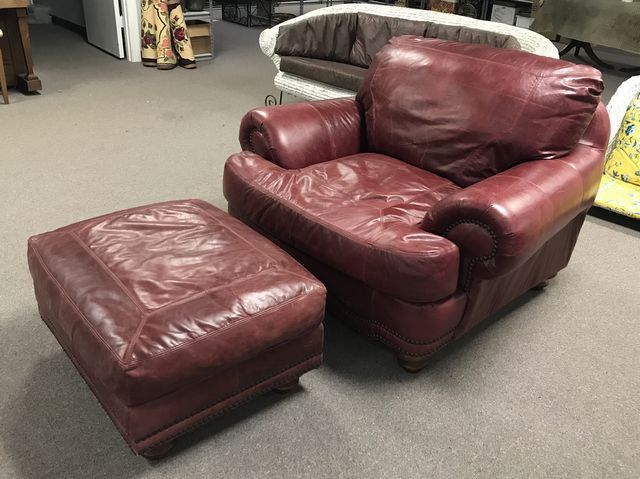 Burgundy Leather Over Sized Chair and Ottoman, one foot is loose, used condition, no tears. Burgundy Leather Over Sized Chair and Ottoman, one foot is loose, used condition, no tears.