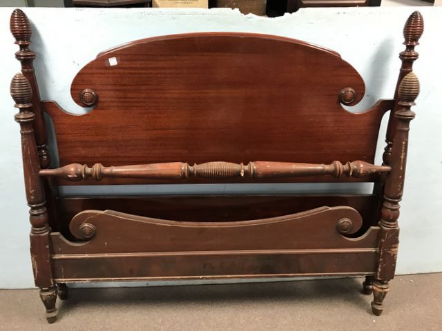 55" Mahogany Mini Post Full Size Bed, has chips and scratches, has wood rails. 55" Mahogany Mini Post Full Size Bed, has chips and scratches, has wood rails.
