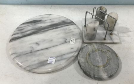 Decorative marble lazy Susan, marble salt & pepper with stand, and base. Decorative marble lazy Susan, marble salt & pepper with stand, and base.