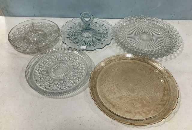 Large pressed glass round tray 14"dia., light blue glass tray with center handle, pink floral pattern try, divided glass tray, small round glass tray. Large pressed glass round tray 14"dia., light blue glass tray with center handle, pink floral pattern try, divided glass tray, small round glass tray.