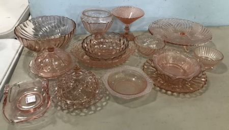Assorted Pink Collectibles Glassware, pink depression compote, covered dish, bowls, France salad bowl, cube pattern dish and bowls. Assorted Pink Collectibles Glassware, pink depression compote, covered dish, bowls, France salad bowl, cube pattern dish and bowls.