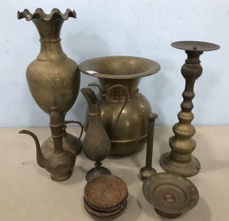 India Brass etched Vase, brass candle holder, pitcher, flute vase, bowl, brass urn with crack. India Brass etched Vase, brass candle holder, pitcher, flute vase, bowl, brass urn with crack.