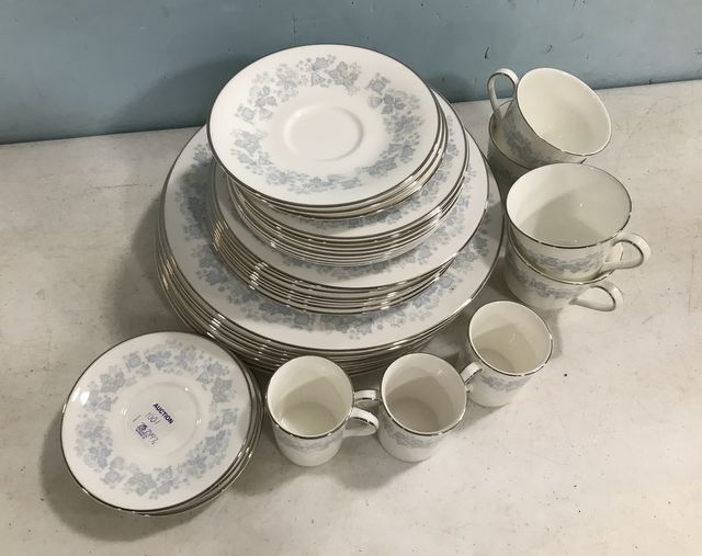 Royal Doulton "Meadow Mist" Bone China, made in England, 8 dinner plates, 8 salad plates, 8 dessert plates, 7 saucers, four mugs, 3 small mugs. Royal Doulton "Meadow Mist" Bone China, made in England, 8 dinner plates, 8 salad plates, 8 dessert plates, 7 saucers, four mugs, 3 small mugs.