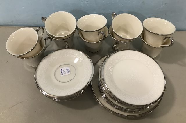 Lenox "Moonspun" Partial China Set, salad plates, dessert plates, saucers, mugs. Lenox "Moonspun" Partial China Set, salad plates, dessert plates, saucers, mugs.