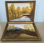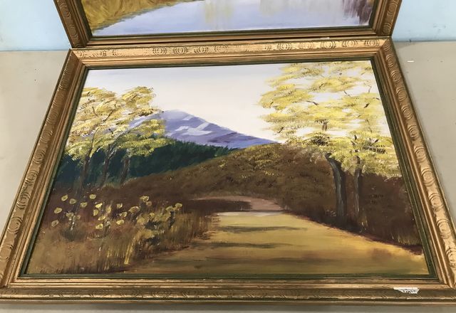 Two Landscape Paintings on board, gold gilt framed, unsigned, variant colors, 21"h., 27"w. Two Landscape Paintings on board, gold gilt framed, unsigned, variant colors, 21"h., 27"w.