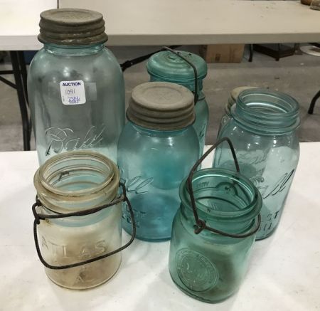 Vintage Ball Mason jars, light blue with metal lids, three with no lid. Vintage Ball Mason jars, light blue with metal lids, three with no lid.