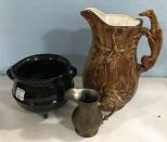 1153 Hand Painted Greyhound Pottery Pitcher, Black Glass Footed Pot, and Brass Pitcher