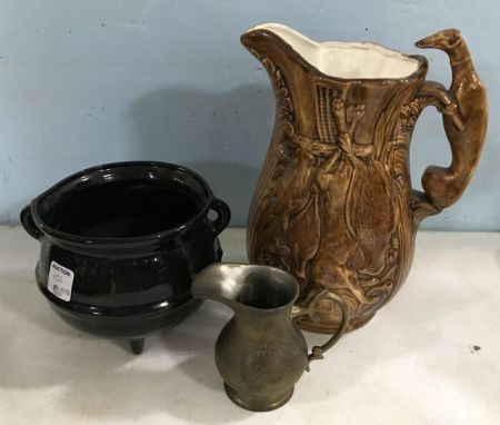 Hand Painted Greyhound Pottery Pitcher, Black Glass Footed Pot, and Brass Pitcher. Hand Painted Greyhound Pottery Pitcher, Black Glass Footed Pot, and Brass Pitcher.