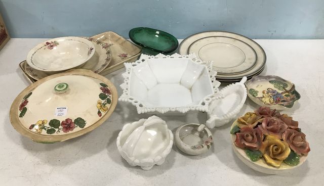 Group of Porcelain serving ware, platters, dinner plates, covered dish, rose ceramic covered dish, milk glass bowl, milk glass basket, milk glass dish, ashtray. Group of Porcelain serving ware, platters, dinner plates, covered dish, rose ceramic covered dish, milk glass bowl, milk glass basket, milk glass dish, ashtray.
