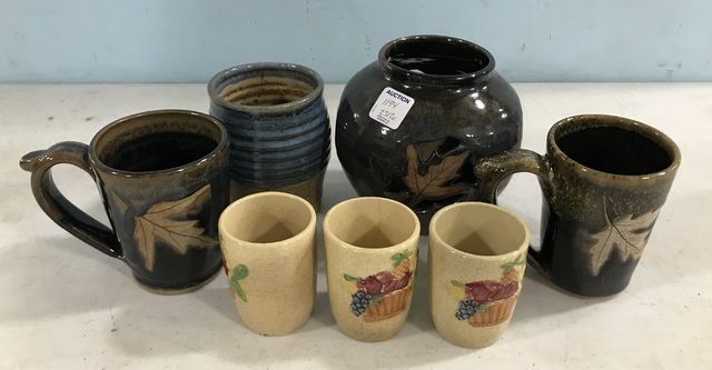Alewine Pottery 2013 stoneware mugs, vase 6"h., Japanese cups, signed pottery glazed vase. Alewine Pottery 2013 stoneware mugs, vase 6"h., Japanese cups, signed pottery glazed vase.