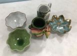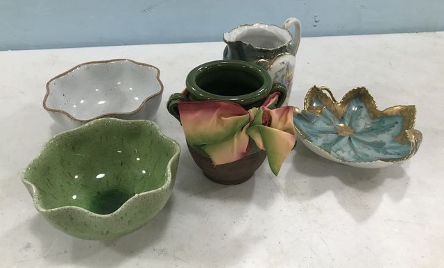 Lefton porcelain leaf dish, porcelain pitcher, pottery small vase, two stoneware bowls. Lefton porcelain leaf dish, porcelain pitcher, pottery small vase, two stoneware bowls.