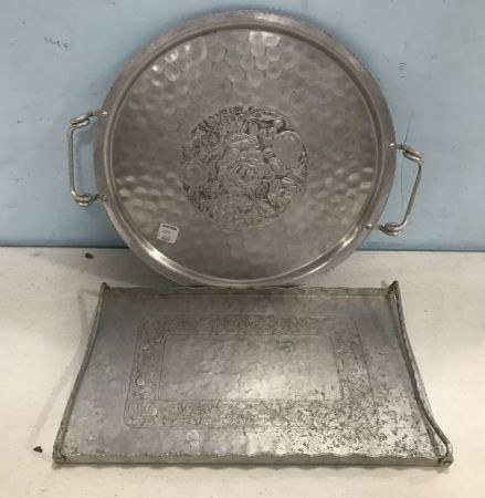 Hand Forged metal round tray 14 1/2"dia., rectangle tray. Hand Forged metal round tray 14 1/2"dia., rectangle tray.
