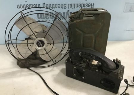 1221 Vintage Coronado Fan, 5 Liter Gas Can, Western Electric Company Military Phone