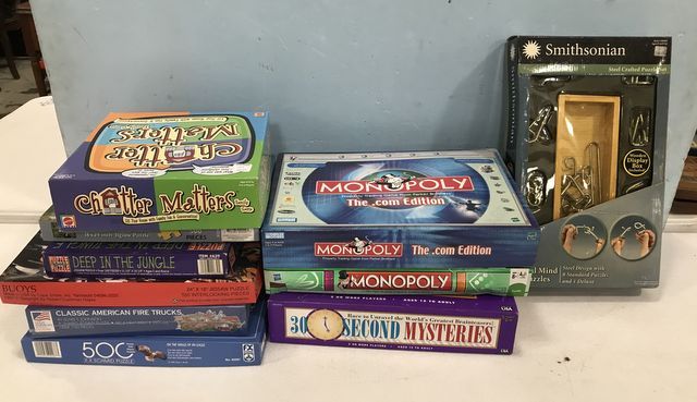 Smithsonian Metal Mind Puzzles, Monopoly, 30 second mysteries, Chatter Matters, Deep in the Jungle, American Fire trunks, puzzles. Smithsonian Metal Mind Puzzles, Monopoly, 30 second mysteries, Chatter Matters, Deep in the Jungle, American Fire trunks, puzzles.