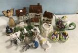 Sympathy Angel, Willowtree angels, Iris teapot, cat cookie press, bunny towel holder, Heart Bundt ceramic, white bunny sugar and creamer, butter dish, duck lidded dish, four house canisters. Sympathy Angel, Willowtree angels, Iris teapot, cat cookie press, bunny towel holder, Heart Bundt ceramic, white bunny sugar and creamer, butter dish, duck lidded dish, four house canisters.