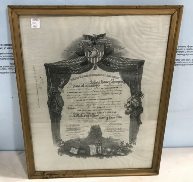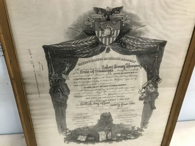 West Point Military Academy Diploma, framed, has wrinkles, 24"h., 19"w. West Point Military Academy Diploma, framed, has wrinkles, 24"h., 19"w.