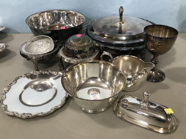 Assorted Group of Silver Plate Serving Pieces, covered dish, footed bowls, creamer, goblet, plate. Assorted Group of Silver Plate Serving Pieces, covered dish, footed bowls, creamer, goblet, plate.