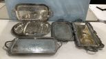 Five silver plate serving trays, some footed, handled, tree of life divided tray, ornate engraved. Five silver plate serving trays, some footed, handled, tree of life divided tray, ornate engraved.