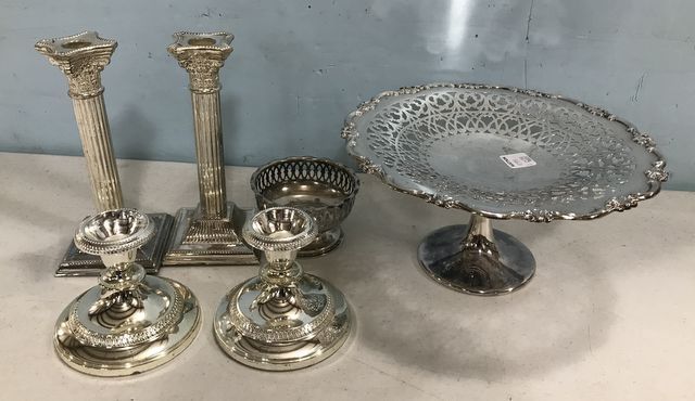 Silver Plate Compote, Two Pair of Candle Sticks, and Small Footed Bowl. Silver Plate Compote, Two Pair of Candle Sticks, and Small Footed Bowl.