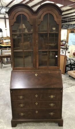Folio 10 Bonnet Top Henredon Secretary, drop front writing desk, glass double door, two wood shelves, three drawers, Chippendale Style, good condition, 82"h., 35"w., 18"d. Folio 10 Bonnet Top Henredon Secretary, drop front writing desk, glass double door, two wood shelves, three drawers, Chippendale Style, good condition, 82"h., 35"w., 18"d.