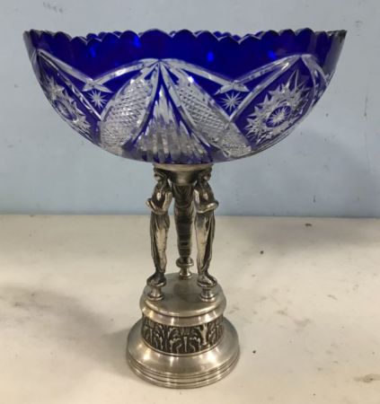 Cobalt Blue Cut to Clear Glass Center Piece Compote, lady figure metal base, 11"h., 9 1/2"dia. Cobalt Blue Cut to Clear Glass Center Piece Compote, lady figure metal base, 11"h., 9 1/2"dia.