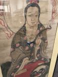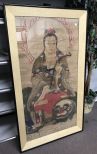 Large Antique Chinese Buddha Painting, hand painted, glassed, modern frame, has age wear, 65"h., 36"w. Large Antique Chinese Buddha Painting, hand painted, glassed, modern frame, has age wear, 65"h., 36"w.