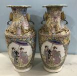 Pair of Chinese Porcelain Palace Urns, gold gilt embossed lizards, bird handles, hand painted, marked on bottom, 24"h., 10"w. Pair of Chinese Porcelain Palace Urns, gold gilt embossed lizards, bird handles, hand painted, marked on bottom, 24"h., 10"w.