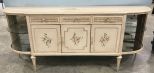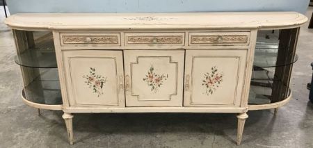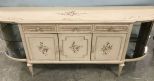 Large French Shabby Chic Style Buffet, open sides display with mirror back, three drawers, three doors, distressed look, painted rose artwork, 36"h., 89"w., 20"d. Large French Shabby Chic Style Buffet, open sides display with mirror back, three drawers, three doors, distressed look, painted rose artwork, 36"h., 89"w., 20"d.