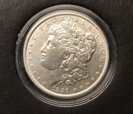 1889 Morgan Silver Dollar, unmarked, fine condition. 1889 Morgan Silver Dollar, unmarked, fine condition.