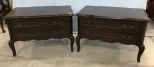 Cherry French Style Side Tables, dark cherry finish, two drawers, brass hardware, good condition, 21"h., 34"w., 22"d. Cherry French Style Side Tables, dark cherry finish, two drawers, brass hardware, good condition, 21"h., 34"w., 22"d.