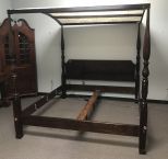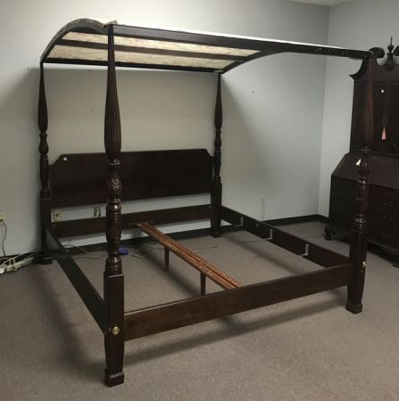 Henredon King Size Canopy Four Poster Bed, Early American Style, with canopy liner, break down for travel, has some finish wear in spots, some damage, comes with box springs. Henredon King Size Canopy Four Poster Bed, Early American Style, with canopy liner, break down for travel, has some finish wear in spots, some damage, comes with box springs.