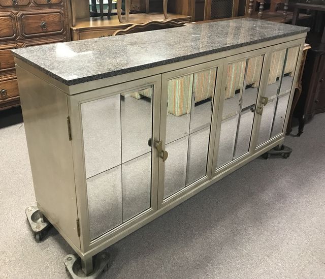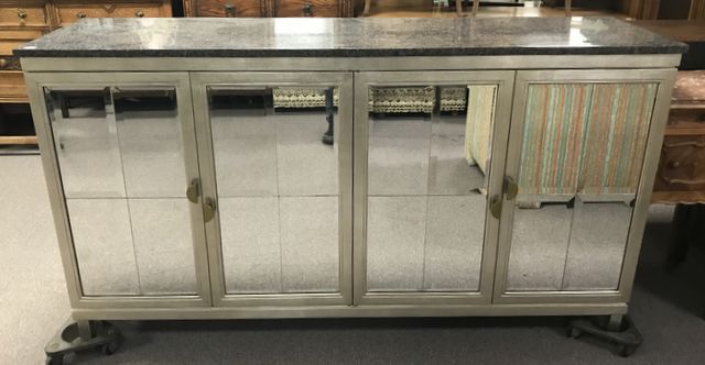Contemporary Style Credenza Cabinet, faux marble top, four door with beveled glass panels, factory painted silver, 39"h., 73"w., 23"d. Contemporary Style Credenza Cabinet, faux marble top, four door with beveled glass panels, factory painted silver, 39"h., 73"w., 23"d.