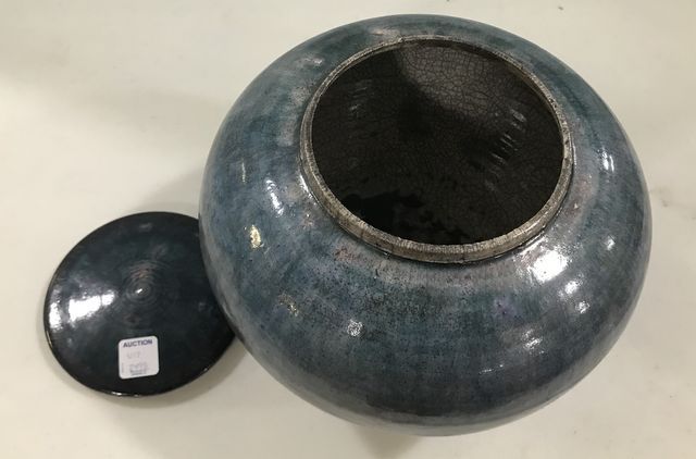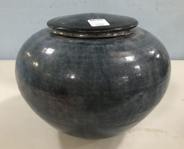 Mississippi Craftsman's Guild Blue Covered Jar, glazed, with lid, 8"h., 10"dia. Mississippi Craftsman's Guild Blue Covered Jar, glazed, with lid, 8"h., 10"dia.