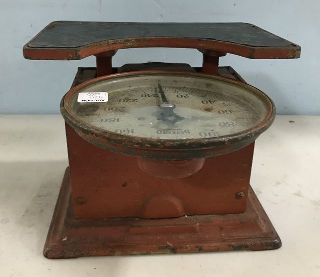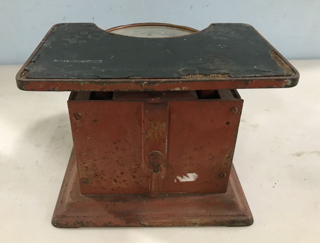 Jacob Bros Company Detecto Jr Weight Scale, red painted metal, working condition, 8"h., 10"w. Jacob Bros Company Detecto Jr Weight Scale, red painted metal, working condition, 8"h., 10"w.