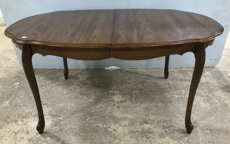 French Provincial Style Dining Table, oval turtle top style, four legs, one leaf, light scuffs on top, 29"h. 62"long., 42"w. French Provincial Style Dining Table, oval turtle top style, four legs, one leaf, light scuffs on top, 29"h. 62"long., 42"w.