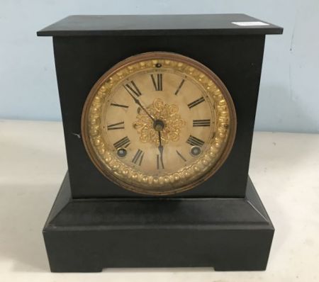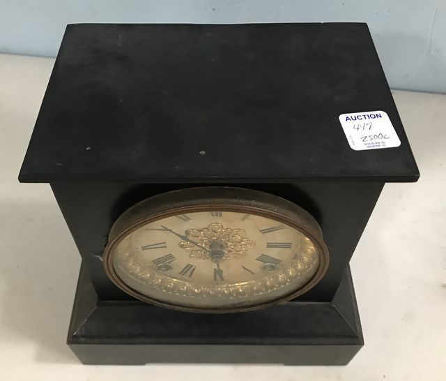 Antique Mantle clock, black painted metal, working condition, has pendulum, no key, glass face cover, 9"h., 8 1/2"w. Antique Mantle clock, black painted metal, working condition, has pendulum, no key, glass face cover, 9"h., 8 1/2"w.