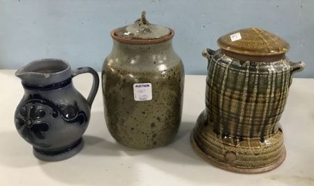 Two signed hand made stoneware jars 8"h., signed blue stoneware pitcher, has small rim chip, 6"h. Two signed hand made stoneware jars 8"h., signed blue stoneware pitcher, has small rim chip, 6"h.