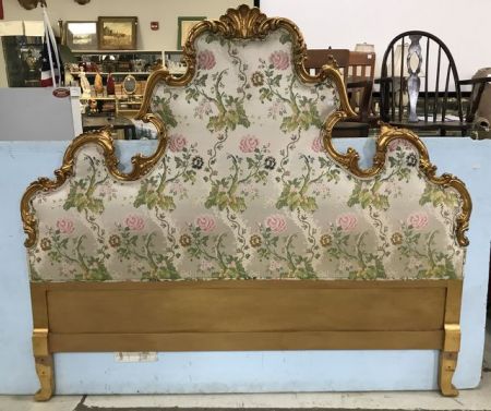 Large Gold Gilt French Upholstered Head Board, ornate design with shell crest, floral head rest upholstery, king size 76"w. Large Gold Gilt French Upholstered Head Board, ornate design with shell crest, floral head rest upholstery, king size 76"w.