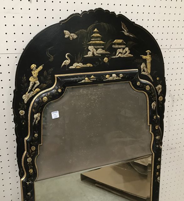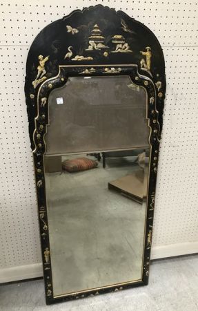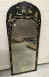Black Lacquer Oriental Trumeau Style Mirror, beveled mirror, hand painted, Chinese men, has some chipping, 60"h., 25"w. Black Lacquer Oriental Trumeau Style Mirror, beveled mirror, hand painted, Chinese men, has some chipping, 60"h., 25"w.