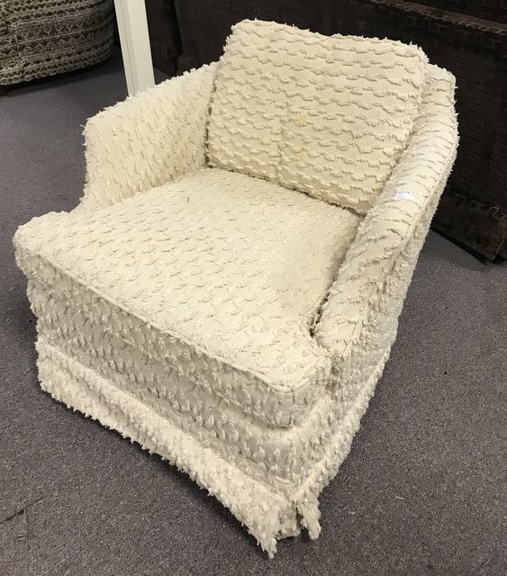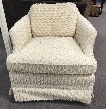 Heirloom Upholstery Arm Chair, white with fringe, High Point, N.C., good condition, other than small stain on one side of back cushion. Heirloom Upholstery Arm Chair, white with fringe, High Point, N.C., good condition, other than small stain on one side of back cushion.