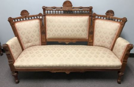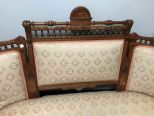 Eastlake Victorian Parlor Settee, walnut, ornate designs, clean upholstery, missing one caster, 66"long, 43"h. Eastlake Victorian Parlor Settee, walnut, ornate designs, clean upholstery, missing one caster, 66"long, 43"h.