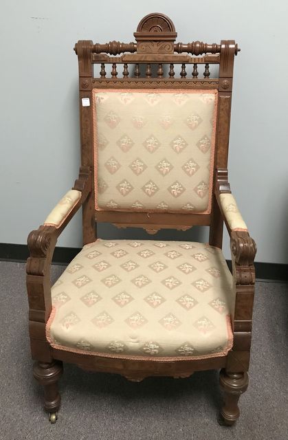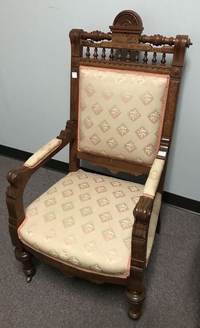 Eastlake Victorian Parlor Arm Chair, walnut, ornate designs, clean upholstery, on casters. Eastlake Victorian Parlor Arm Chair, walnut, ornate designs, clean upholstery, on casters.