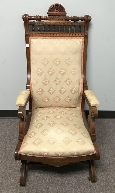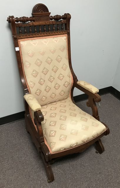 Eastlake Victorian parlor rocker, walnut, ornate designs, clean upholstery, on casters. Eastlake Victorian parlor rocker, walnut, ornate designs, clean upholstery, on casters.