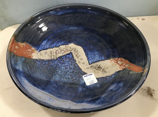 Hand Made pottery bowl, glazed, not signed blue, 2"h., 12"dia. Hand Made pottery bowl, glazed, not signed blue, 2"h., 12"dia.