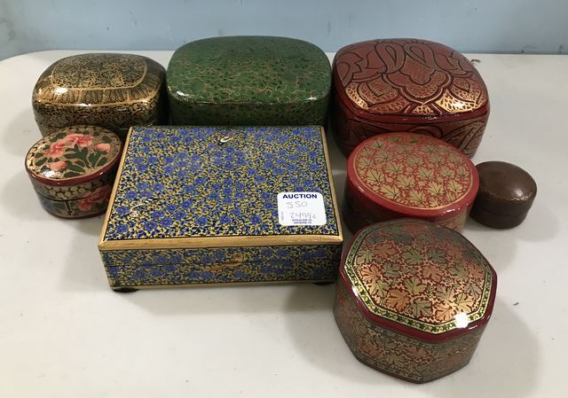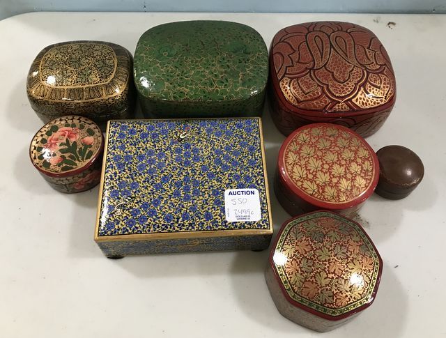 Eight decorative trinket boxes, assorted styles and sizes, Floral designs, hand painted. Eight decorative trinket boxes, assorted styles and sizes, Floral designs, hand painted.