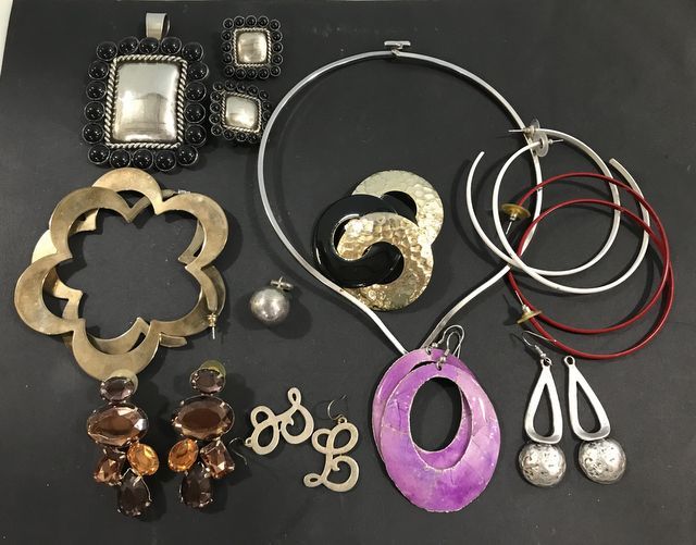 Group of Costume and Modern Jewelry Pieces , 8 pair of earrings, silver plate pendants, and necklace. Group of Costume and Modern Jewelry Pieces , 8 pair of earrings, silver plate pendants, and necklace.