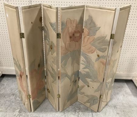 Six panel folding screen, carved roses, modern decor piece, 38"h., 54"w. Six panel folding screen, carved roses, modern decor piece, 38"h., 54"w.