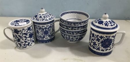 Blue and white oriental pottery, mugs, small bowls, marked, porcelain. Blue and white oriental pottery, mugs, small bowls, marked, porcelain.